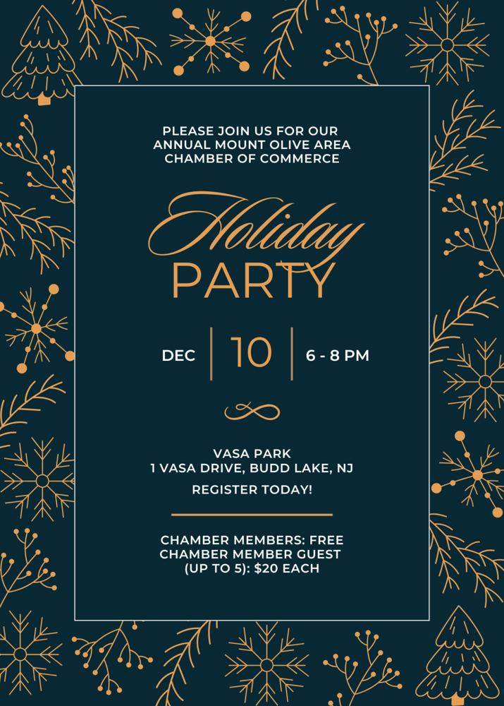 Join us for our Annual Mount Olive Area Chamber of CommerceHoliday Party at Vasa ParkWednesday, December 10, 20256pm - 8pmThe evening will include Entertainment, Food, and DrinksEach Chamber Member will receive 1 free ticket with registration.Guests and Sponsorship have a small additional charge.This event will sell out quickly so be sure to register.All tickets to attend need to be purchased in advance. No registrations are accepted at the doorWe are asking for monetary donations for The Mt. Olive Food Pantry.Please see the separate donation link under our events page on our website. Your donation is greatly appreciated.Entertainment: Music by The Power TonesTarot Card ReaderCatering by Ginnette's CateringLet's get festive and have fun!!